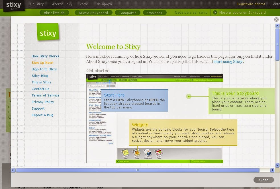 Stixy es una herramienta web 2.0 bastante parecida a Wallwisher. Se trata de construir un mural interactivo o tablón de anuncios. Permite añadir imágenes, ficheros,